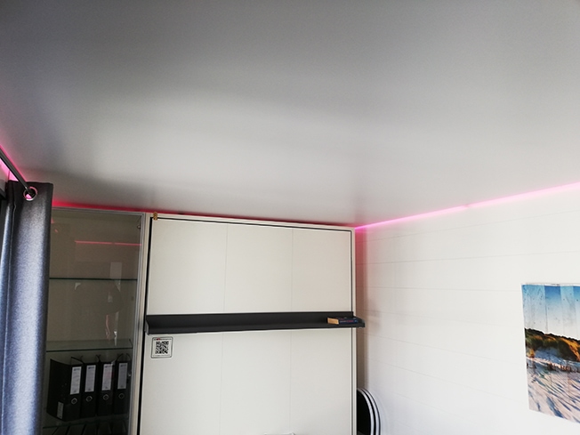 unter anderem mit unseren matten, weißen Spanndecken im Wohn-, Schlaf- und Arbeitsbereich inkl. umlaufender LED-Beleuchtung, umgesetzt mit unserem LED-Slim-Profil + Diffusor.