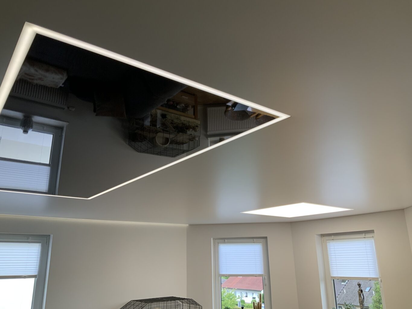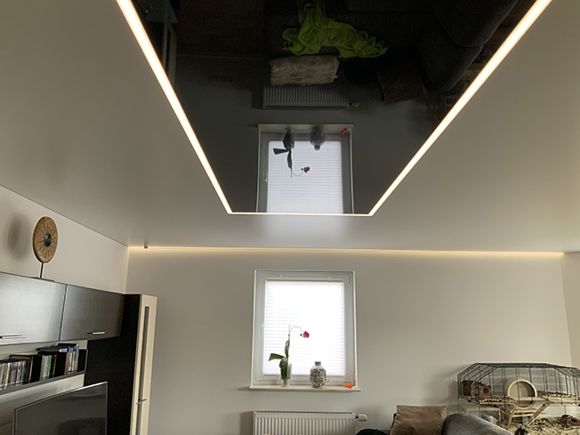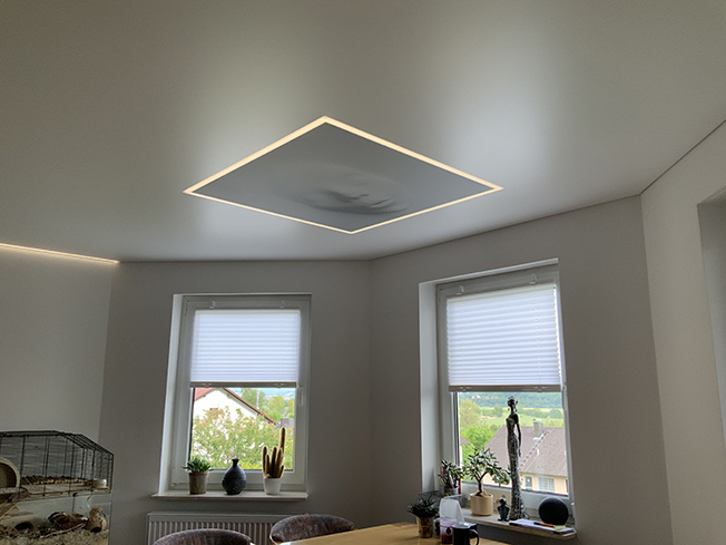 Ein neu gestaltetes Wohnzimmer. Neben diversen Renovierungsarbeiten wurde hier eine weiße sowie eine schwarze Spanndecke, jeweils mit umlaufender LED-Beleuchtung montiert. Ein besonderer Eyecatcher ist die bedruckte Spanndecke mit Doppel-Effekt. Einmal mit umlaufendem LED-Licht und auch einmal komplett hinterleuchtet.