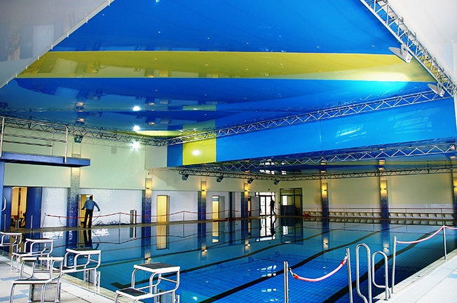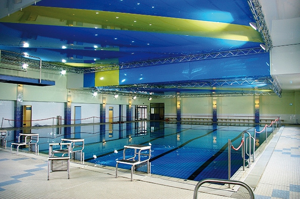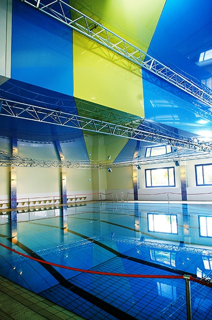 The bicoloured stretch ceiling in the school’s swimming pool is a real highlight. The mirror effect seams to enlarge the room and the acoustic effect is unbeatable.