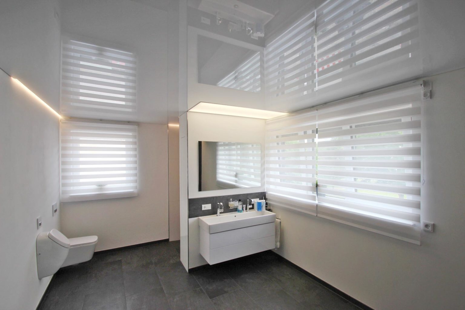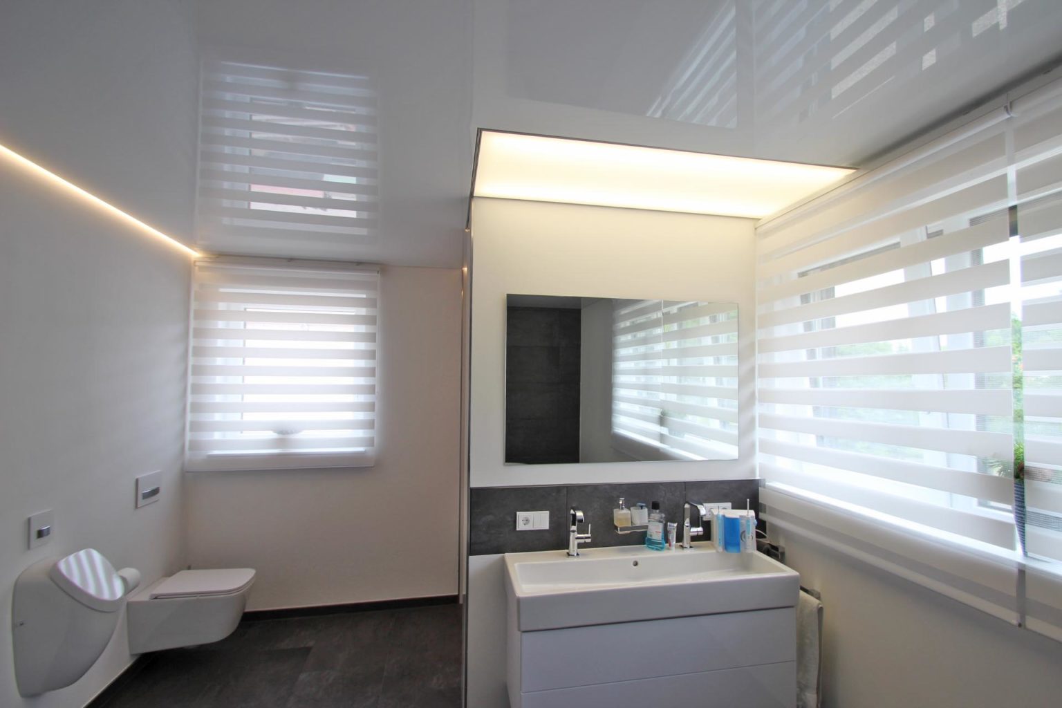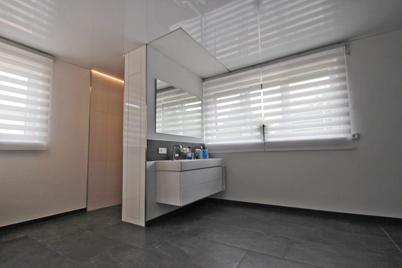 Neues Bad perfekt in Szene gesetzt mit weißer Lackspanndecke und Betonung des Waschbereichs mit abgesetzter Lichtdecke. Zusätzliche bringen LED-Leisten eine spannungsvolle Beleuchtung mit in den neuen Wohlfühlbereich.
