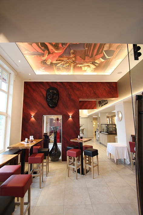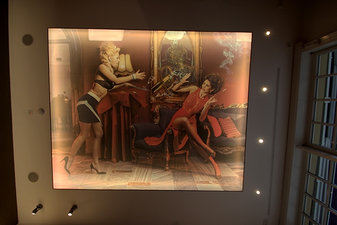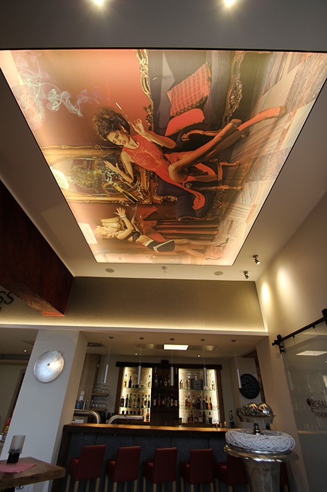 The picture on the stretch ceiling matches perfectly to the interior design. The lighting combined with the excellent printing quality seems to bring the picture to life.