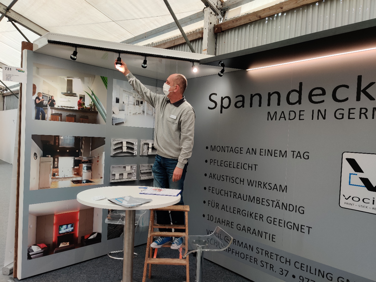 We would be pleased to advise you and present our simple and fast system to install stretch ceilings in your home. Brochures and samples on our booth will show you all possibilities with stretch ceilings. We offer you – only on the fair – 20% on your Bio-Pruf- stretch ceiling.