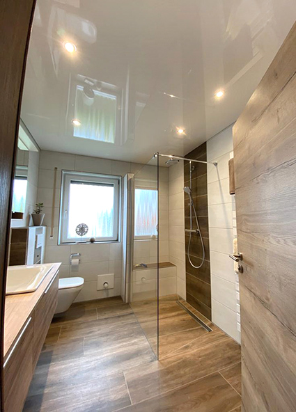 The special production procedure for stretch ceilings offers great conditions for damp and wet rooms. Stretch ceilings are waterproof and there won’t be any waterdrops even with high humidity as the material is adjusting to the room temperature.